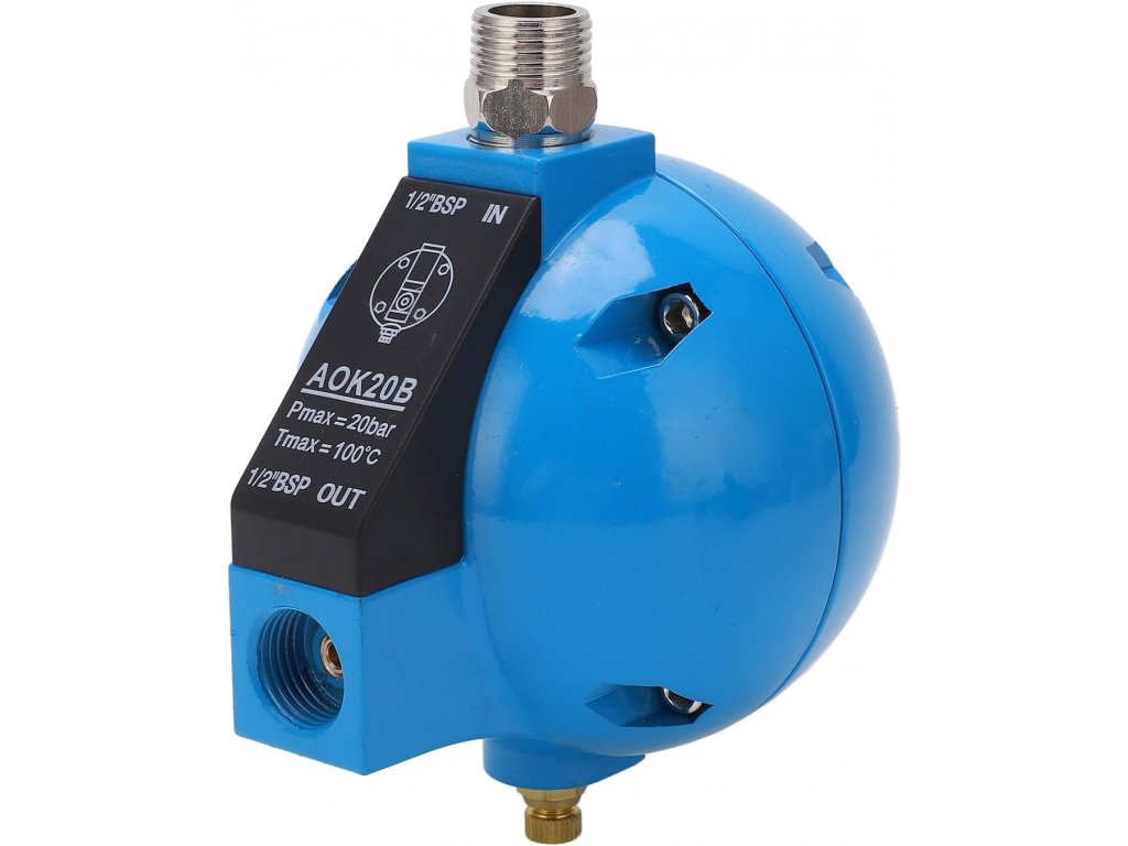 Plovákový odvaděč kondenzátu automaticky odvádí nežádoucí zkondenzovanou vodu ze vzdušníku, filtru nebo separátoru v systémech stlačeného vzduchu na výstupu pístových kompresorů s tlakem do 16 bar. Externí (vnější) odpouštěč kondenzátu se montuje pod tlakovou nádobu, filtr nebo separátor se vstupním rozměrem závitu G 1/2". Plovákový odvaděč kondenzátu je určen pro námi prodávané filtrační sestavy Profi, Industry a jiné výrobce filtrů a separátorů stlačeného vzduchu vycházejícího z olejového kompresoru. Externí plovákový odvaděč AOK20B kondenzátu má jednoduchou montáž s napojením výstupního potrubí se závitem G1/2" a také s možností manuálního odkalení ventilem na spodní části. Lehké a přitom pevné hliníkové tělo plovákového odvaděče je zkonstruováno tak, že automaticky funguje bez využití elektrické energie s rychlostí odvodu zkondenzované kapaliny 400l/h.