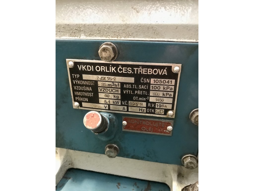 Nabízíme k prodeji použitý český dvoupístový vzduchový kompresor Orlík 2-JSK 75 BAZAR s originálním nesmrtelným elektromotorem MEZ Mohelnice 7,5kW propojený přes řemenici tvoří kompresorovou stanici PKS 50 s výkonem 50 m3/hod. Poctivá česká kvalita. Kompresor je po servisu a v dobrém technickém stavu.