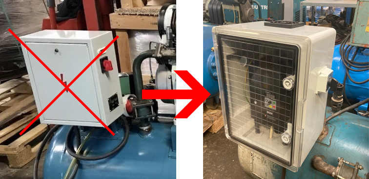 Náhrada za původní elektroskříň s rozběhem trojúhelník-hvězda. Frekvenční měnič pro plynulý rozběh kompresoru. Řešení pro slabé jističe.