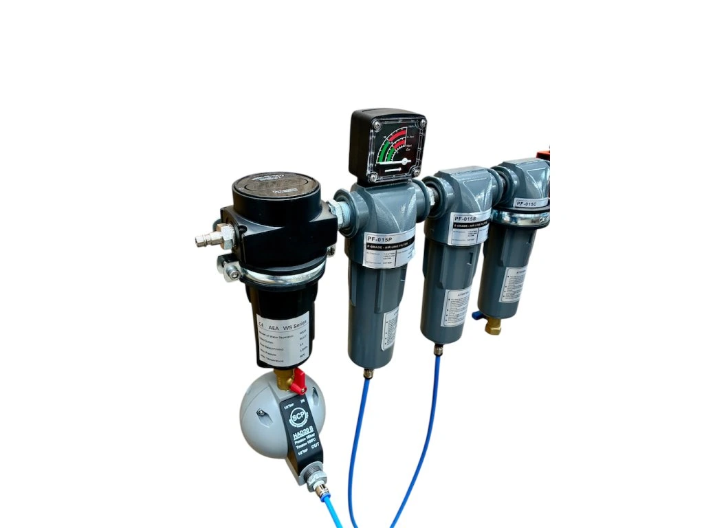 Cyklonový separátor je doplněn automatickým odváděčem kondenzátu vnější, následné filtry 1. a 2. stupeň jsou doplněny vnitřním automatickým vnitřní odváděčem separátu (olej+voda+prach).