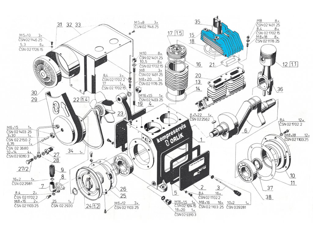 Hlava válce pro kompresory Orlík 1 JSK, 2 JSK, 3 JSK a 3 DSK. Náhradní díl pro servis nebo generální opravu kompresoru. (bez 4x šteftů)