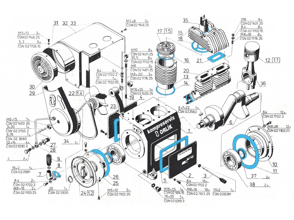Pozn.: Teplota je ve válci je 225 °C, dále na výtlačné přírubě je teplota stále vysokých 175 °C, ještě u zpětného ventilu je teplota 150 °C (viz technická specifikace stroje - návod. Proto TĚSNĚNÍ POD HLAVU vyrábíme ze speciálního materiálu těsnění TEMASIL, který je vhodný pro zátěž v maximální teplotě 330 °C (krátkodobě až 450 °C ). Tím zajišťuje své dlouhodobé špičkové schopnosti i při dlouhodobém provozu kompresoru. Na trhu se hojně vyskytují neoriginálních levnější náhrady z běžného materiálu určeného pro teploty do 120 °C, který rychle ztrácí své těsnící schopnosti ventilové hlavy / koncentrického ventilu a dochází k masivním únikům vzduchu a nefunkčnosti kompresoru.