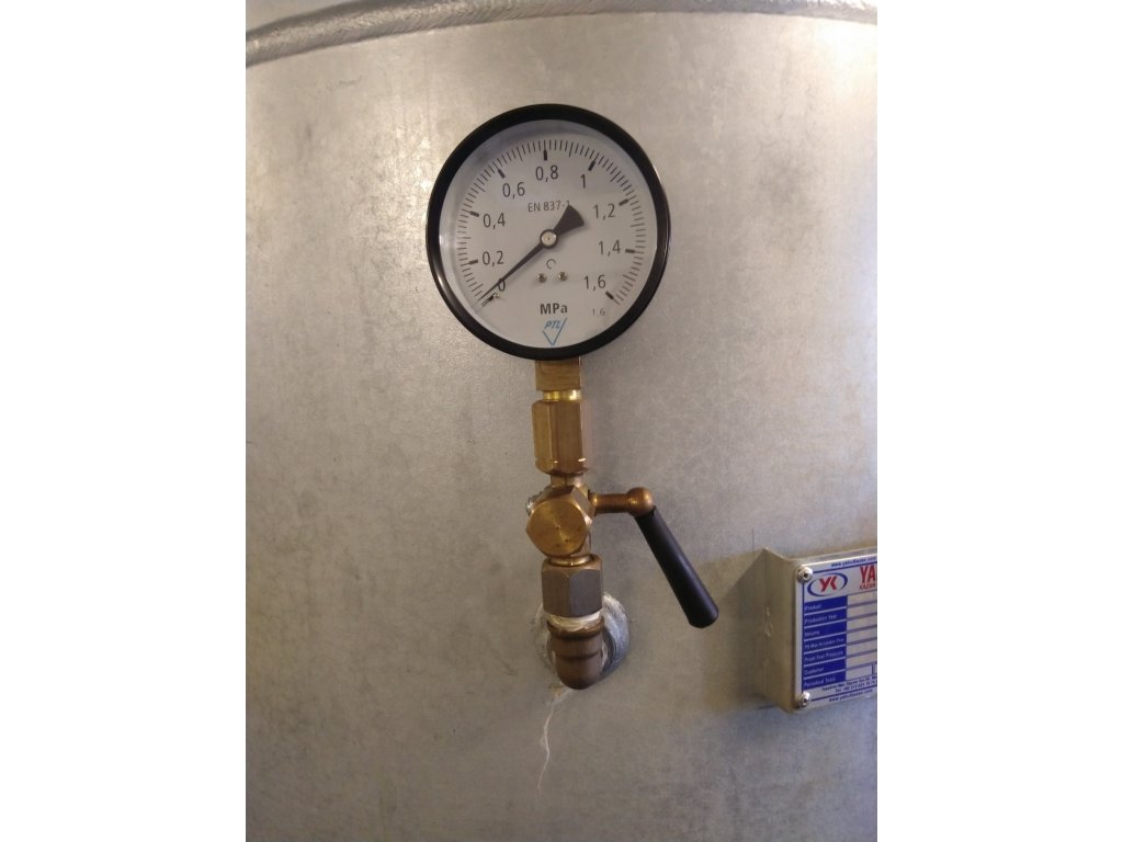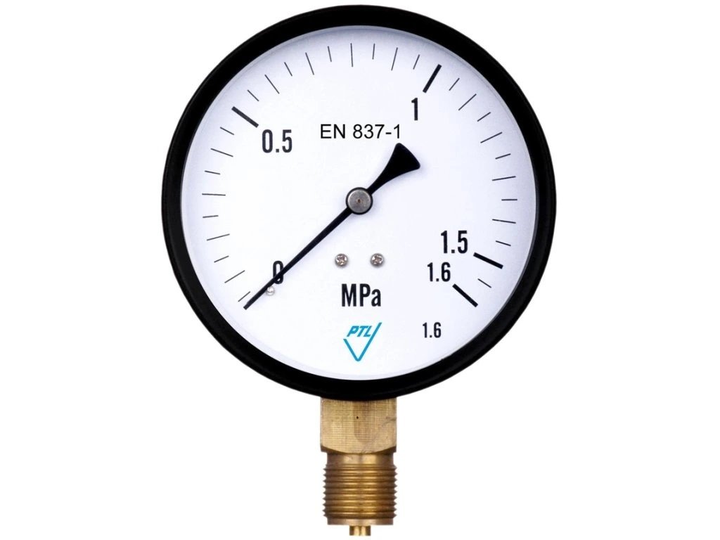 Manometr s českou stupnicí v MPa s velkým ciferníkem 100 mm pro dobrou čitelnost a odolným železným tělem.