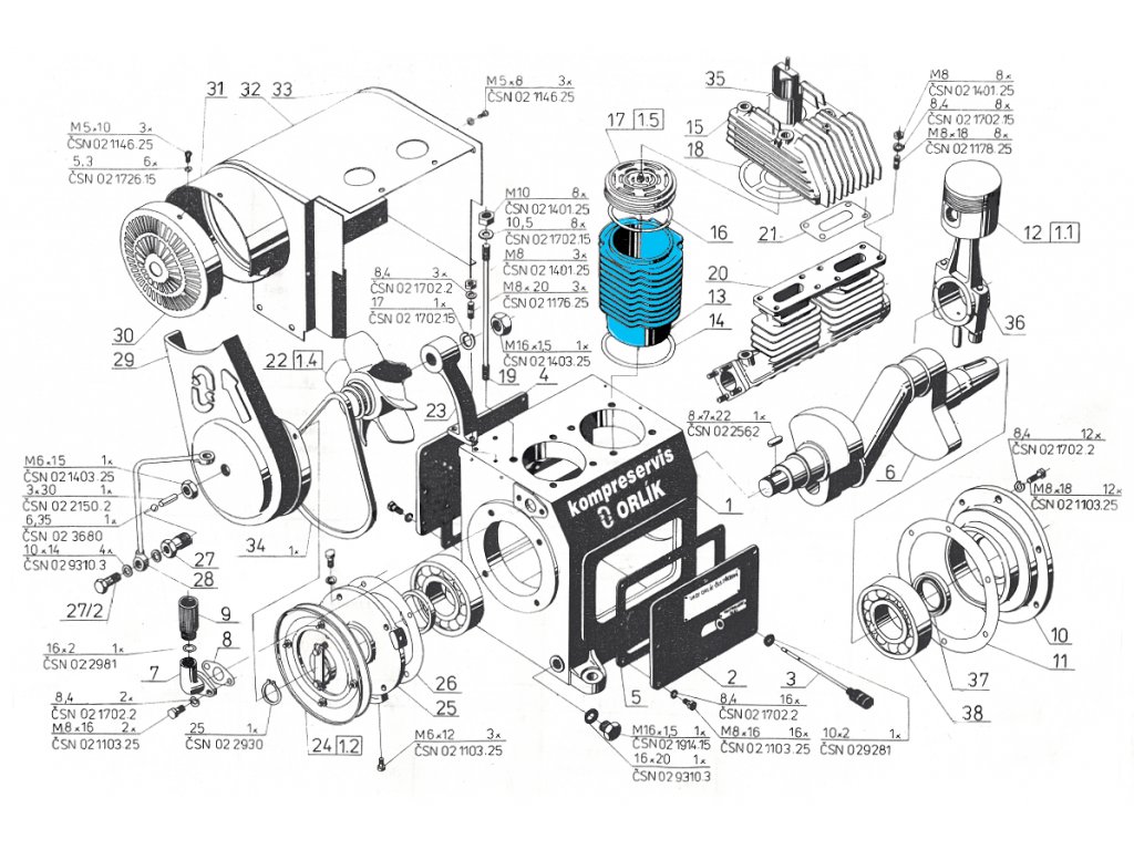 Válec určený pro pístové kompresory z řad Orlík 1 JSK, 2 JSK, 3 JSK a 2/3 DSK. Válec je nově odlitý v české slévárně a profesionálně obroben přímo na originální rozměr nového válce 75 mm. Náhradní díl pro servis nebo generální opravu kompresorů VKDI Orlík JSK 75.